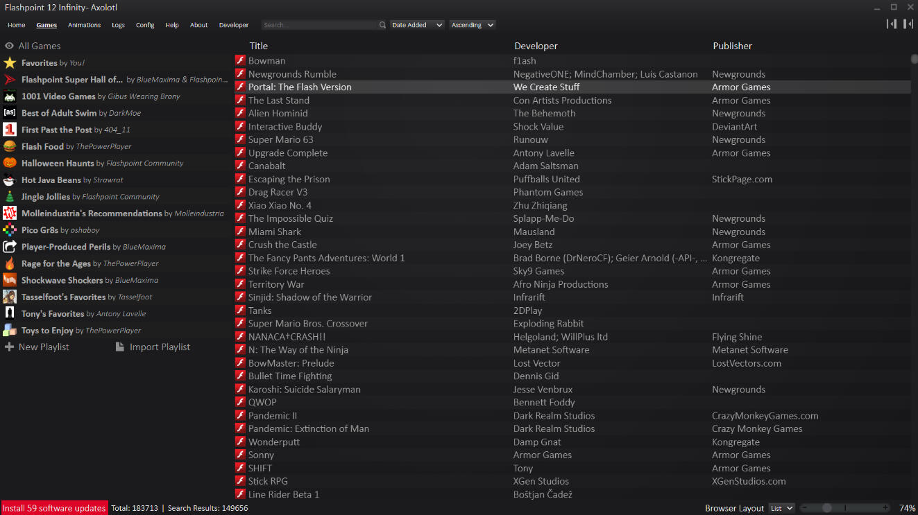 Screenshot of the ‘Games’ section of Flashpoint Archive, taken from my personal computer, featuring almost 200,000 games that would have otherwise been inaccessible due to the death of Flash.